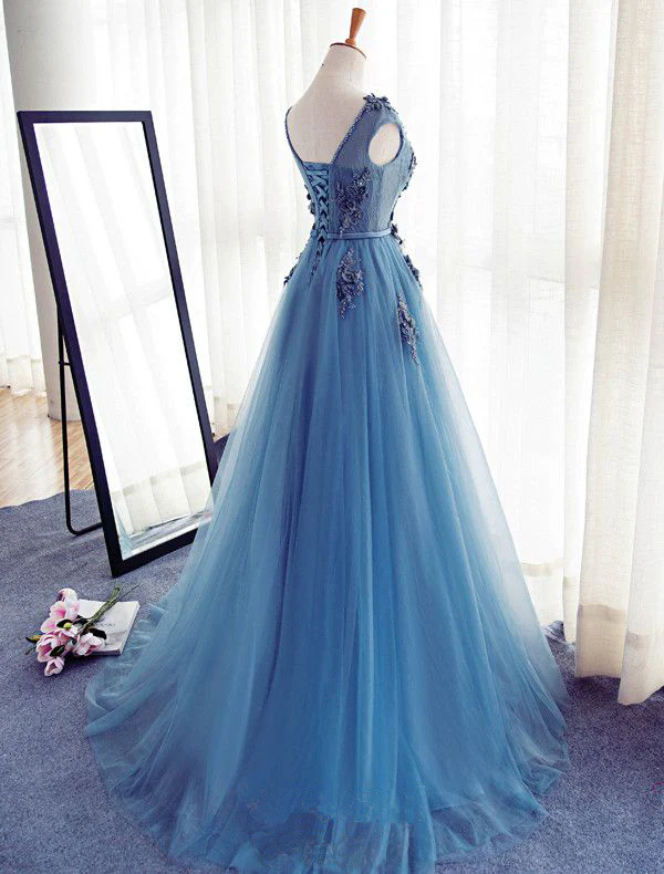 • Charming Long Tulle Handmade A Line Blue Prom Gowns,Best Formal Women Dresses OK243