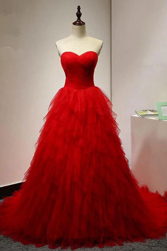 Chic Sweetheart A Line Zipper Back Red Ruffles Cheap Long Prom Dresses OKG22