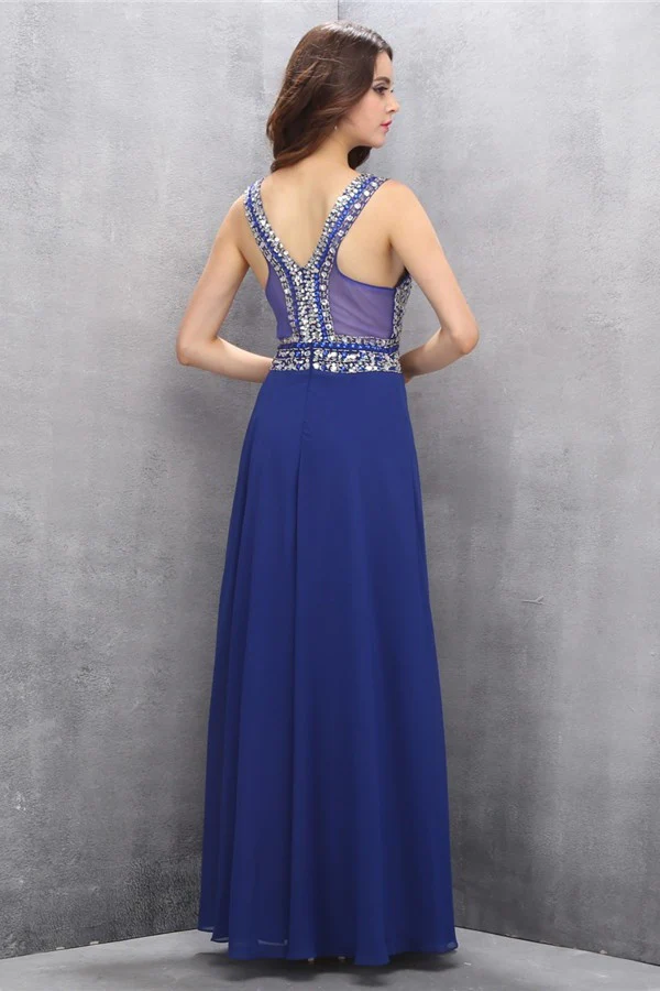 Chiffon Beading Royal Blue V-neck Long Elegant Prom Dress K619