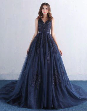 • Dark Blue V Neck A Line Appliques Tulle Long Prom Dresses OK820