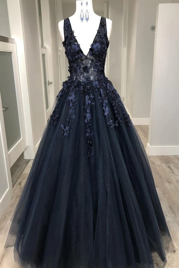 Deep V Neck Appliqued Prom Dress See Through Floor Length Formal Dresses OKS4