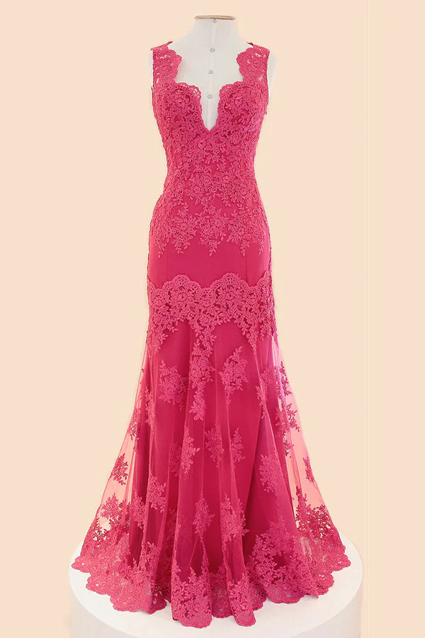 • Deep V-neck Fuchsia Mermaid Long Lace Prom Dress ED1032