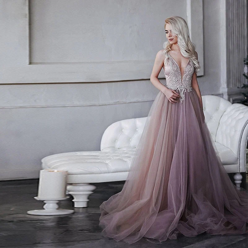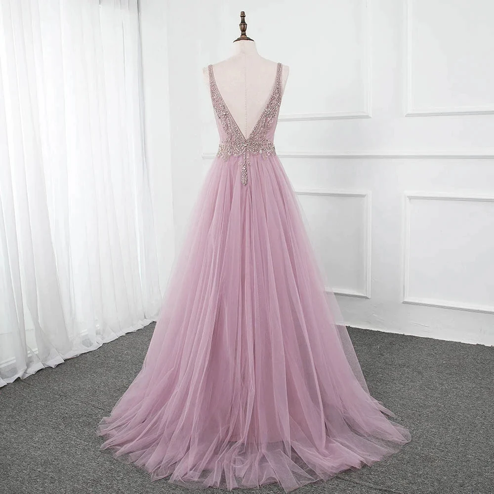 • Deep V Neck Long A-line Prom Dress Rhinestones Beaded Tulle V Back Girl Party Gown OKW67