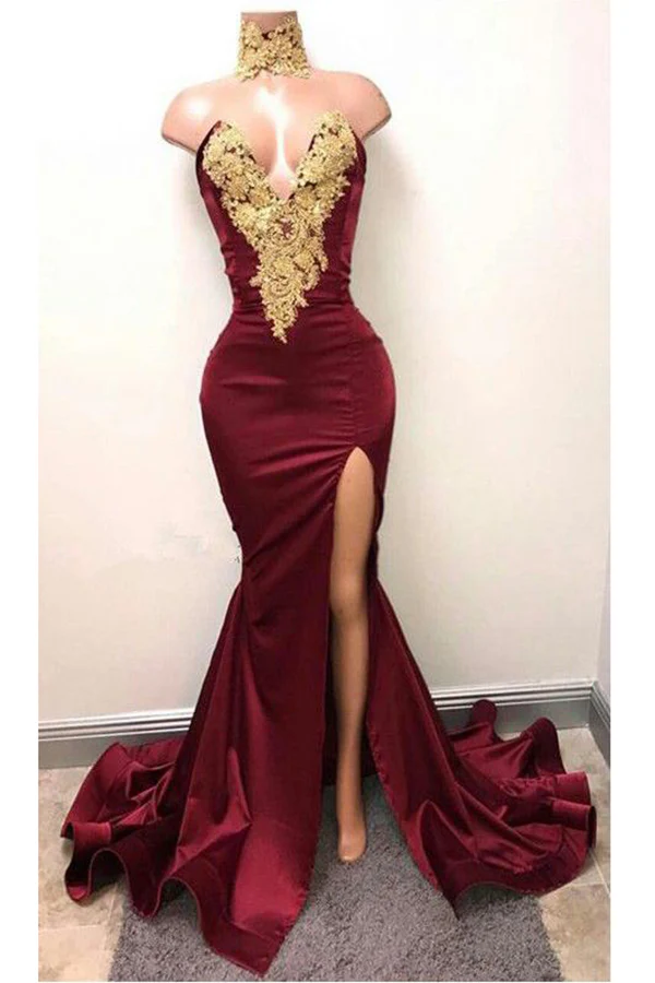 • Elegant Burgundy Mermaid Appliques High Neck Split Sexy Prom Dresses OKA83