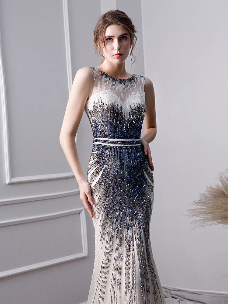 Elegant Mermaid Long Tulle Beading Prom Dress OKL24