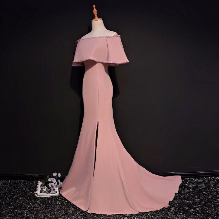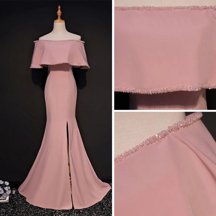 Elegant Trumpet Mermaid Off-the-shoulder Floor Length Pink Prom Dresses With Slit OK631