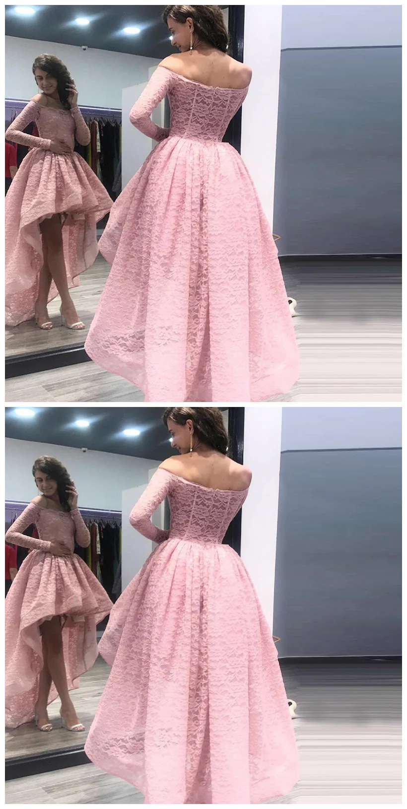 • Fashion A-Line Off the Shoulder High Low Long Sleeves Pink Lace Prom Dresses OKF54