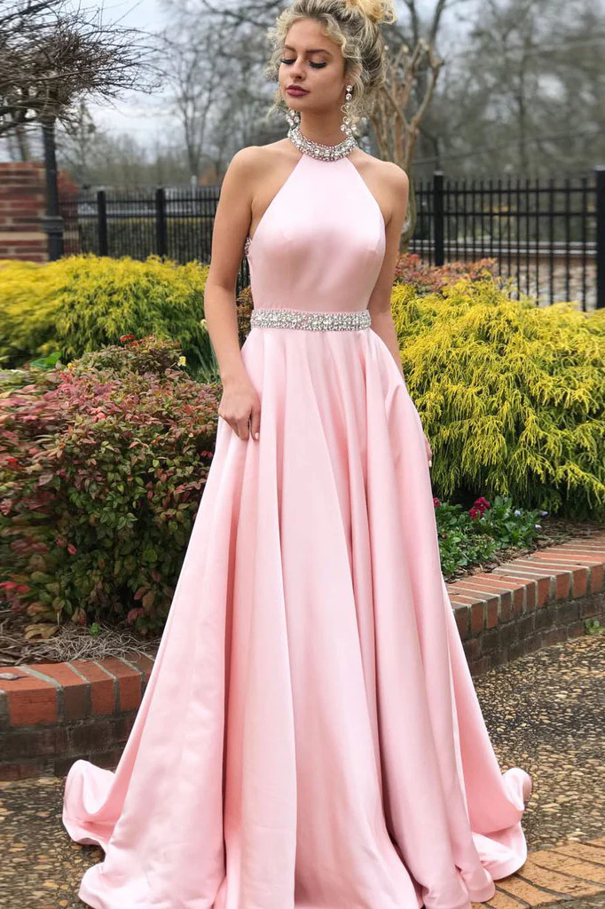 • Fashion A-line Pink High Neck Sexy Back Cheap Beading Prom Dresses OKA15