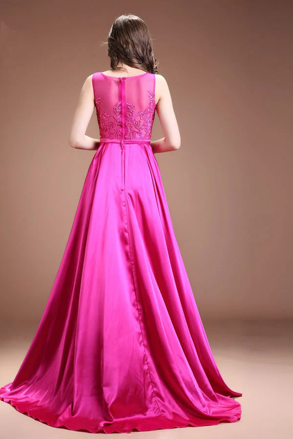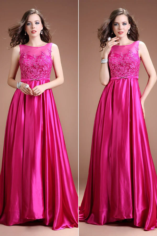 • Fuchsia Satin Lace Beaded Cap Sleeves Long Prom Dress ED0839