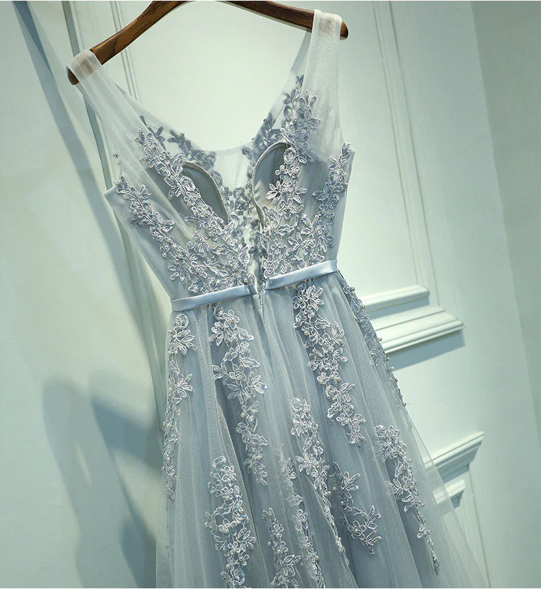 Gray Tulle Long V-neck Evening Dress A Line Appliqued Prom Dress OKP166