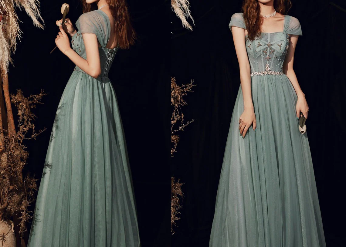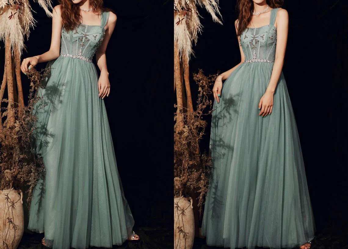 • Green Spaghetti Straps Prom Dress Fairy Evening Party Dress Lace-up Slleveless Prom Gown OKW78