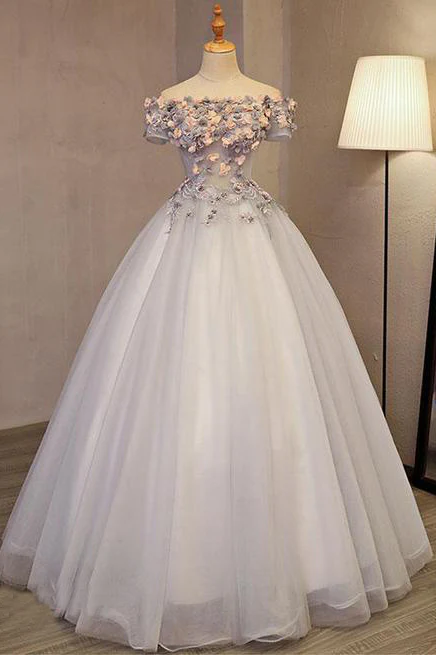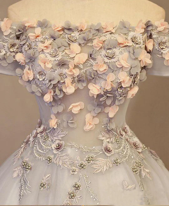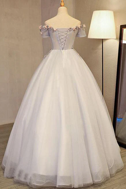 • Grey Long Applique Off the Shoulder Tulle A-Line Prom Dresses OK875