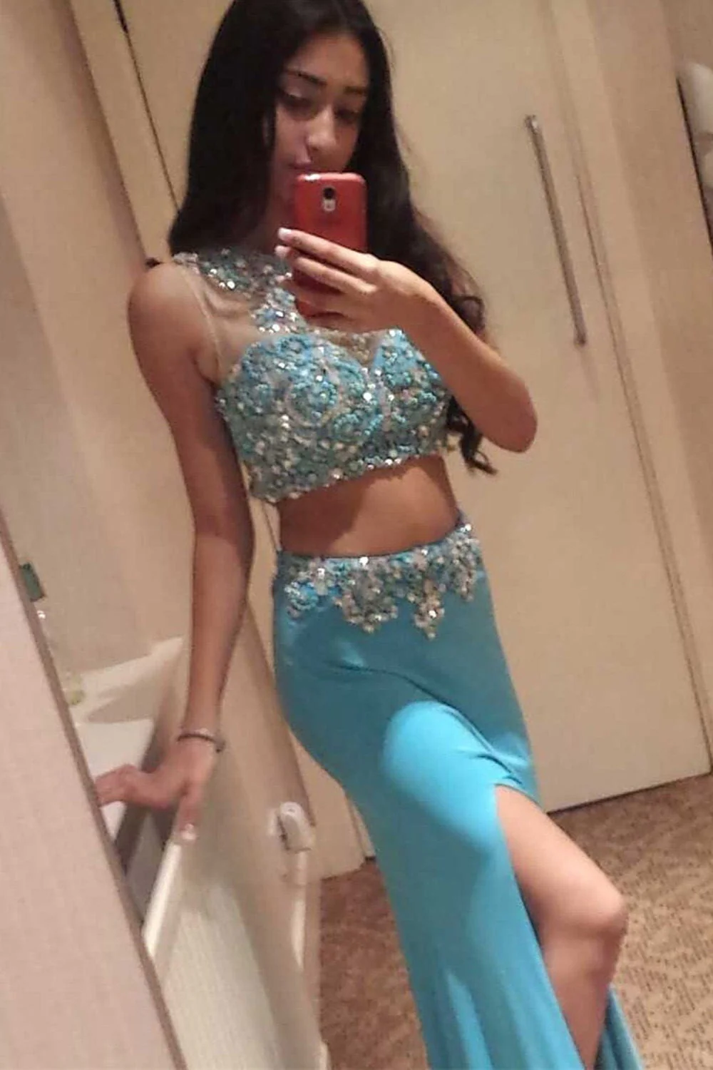 Ice Blue 2 Pieces Long Front Split Charming Prom Dress K82