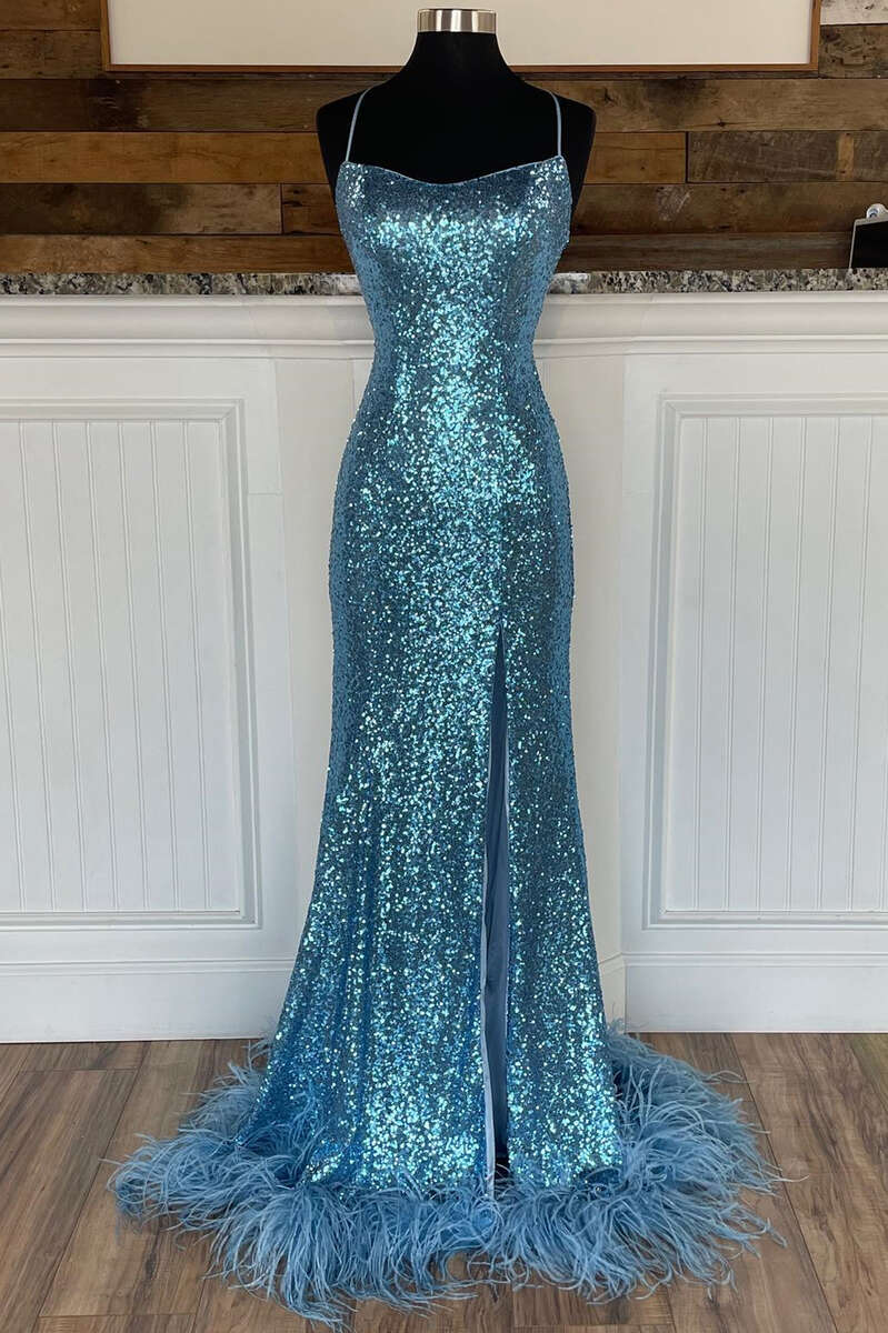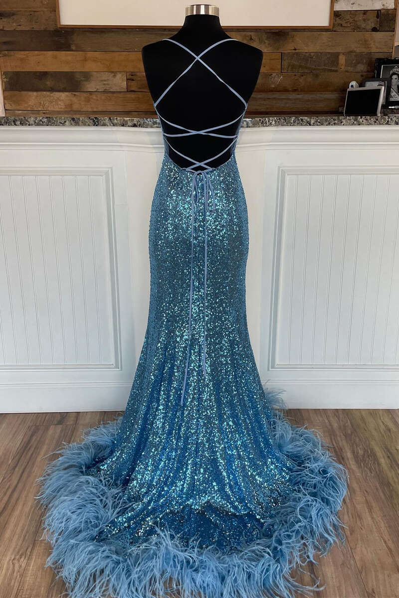 • Ice Blue Sequined Criss Cross Mermaid Spaghetti Straps Long Prom Dress OK1527