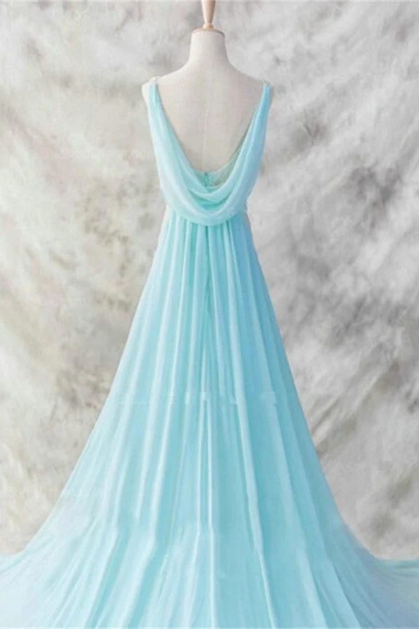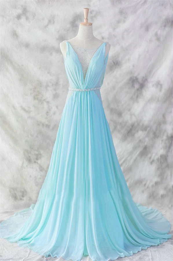 • Ice Blue Simple Deep V-neck Beaded Open Back Prom Dress OK22
