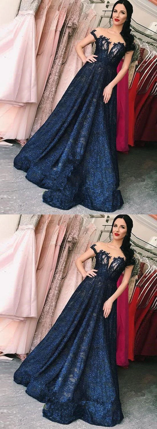 • Lace A Line Dark Blue Long Prom Dresses,V Neck Evening Dresses OKE55