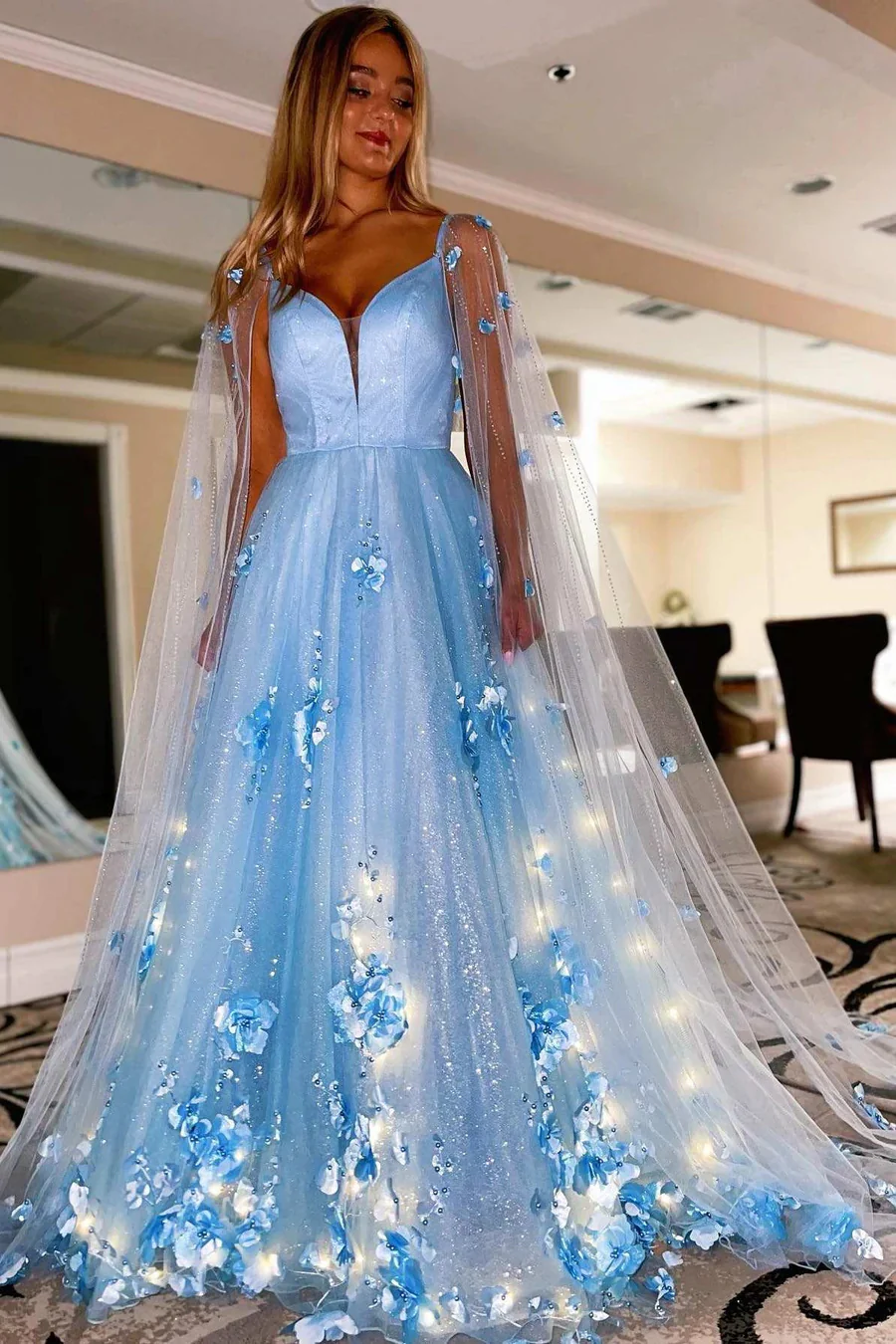 Lavender 3D Floral Lace Plunge V A-Line Prom Dress with Cape Sleeves Formal Evening Dress OK1899