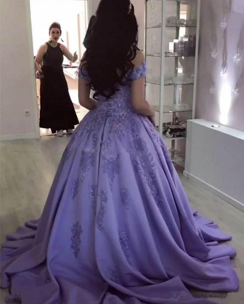 • Lavender Ball Gown Off the Shoulder Lace Appliques Prom Dress OKJ66