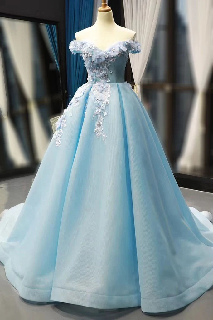 • Light Blue Off the Shoulder Ball Gowns Prom Dresses with 3D Flowerss OKV2