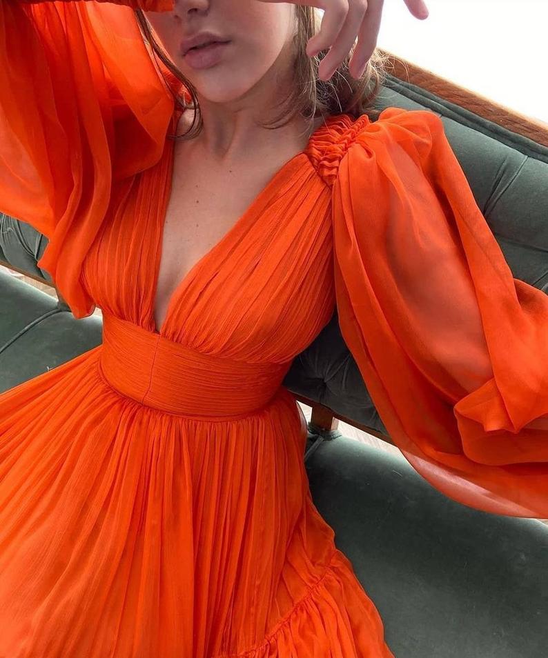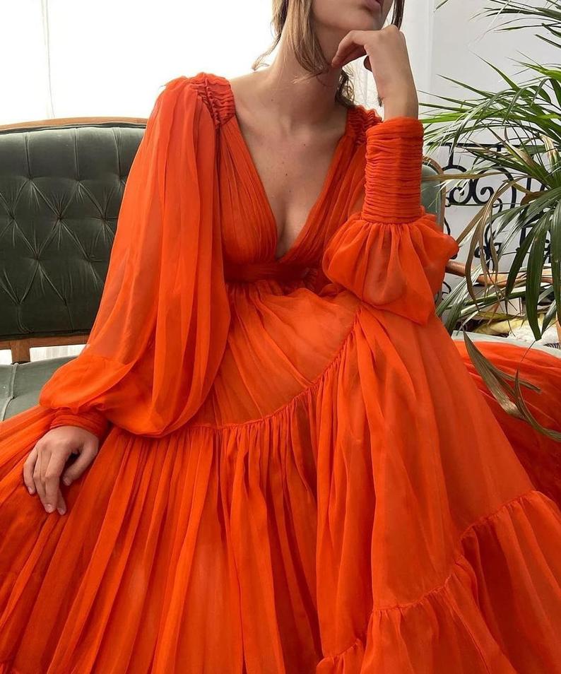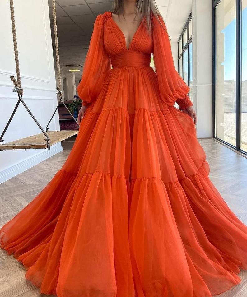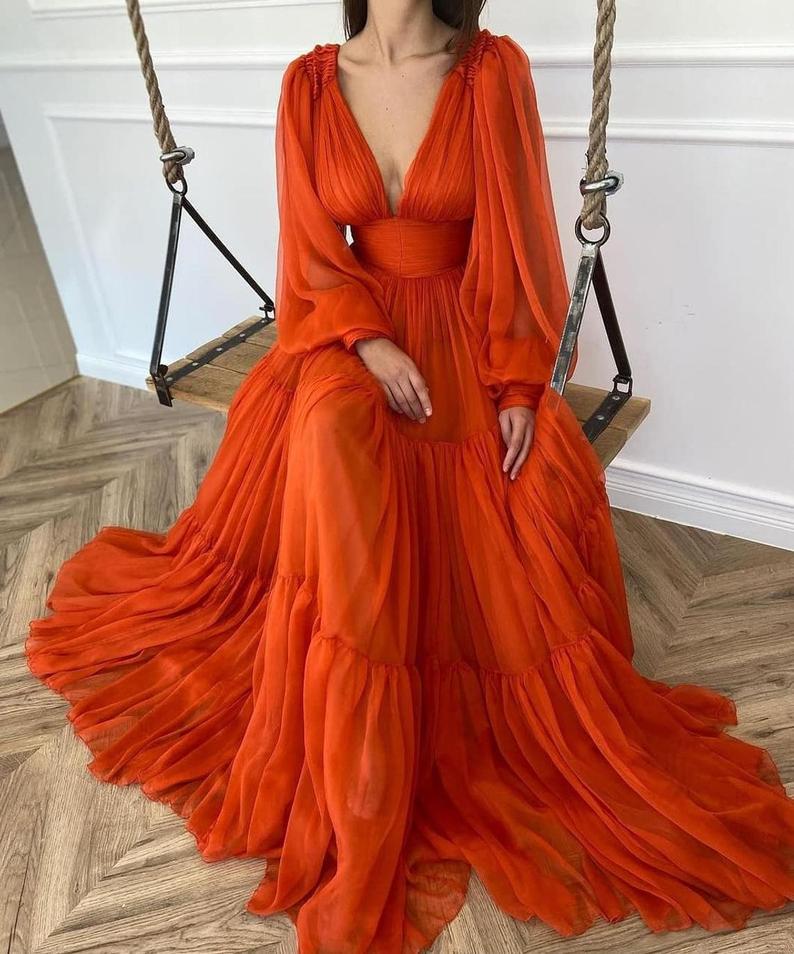 • Long Sleeves A-line Deep V Neck Orange Simple Prom Dress Maxi Dress OKV98