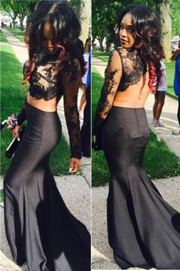 • Long Sleeves Backless Lace Satin Black Mermaid 2 Pieces Prom Dress K669