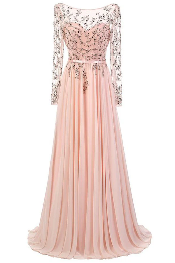 • Long Sleeves Lace Pink Chiffon A-line Beading Open Back Prom Dress K692