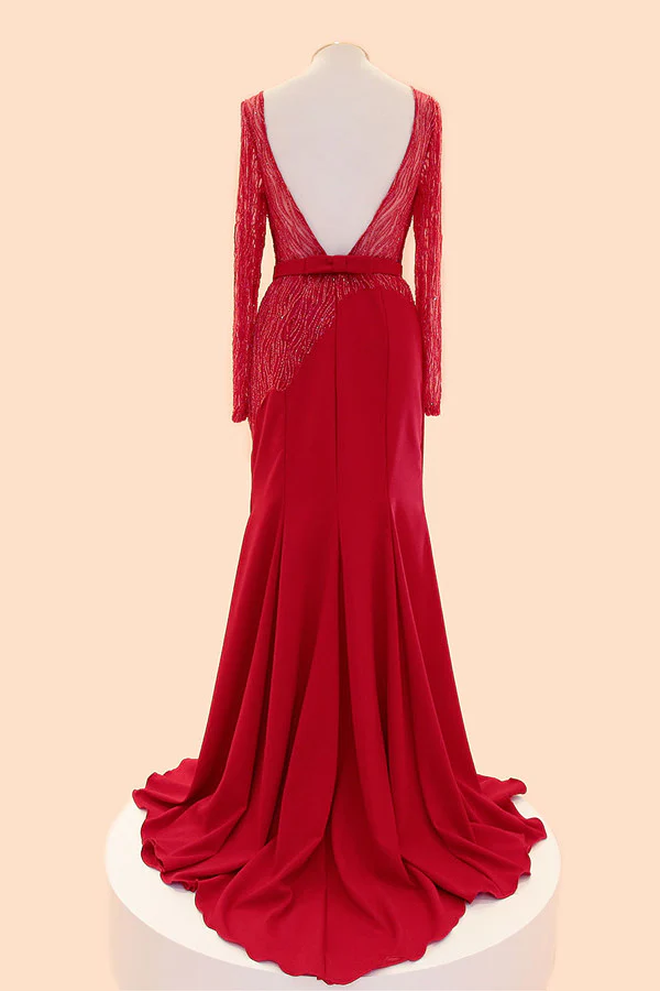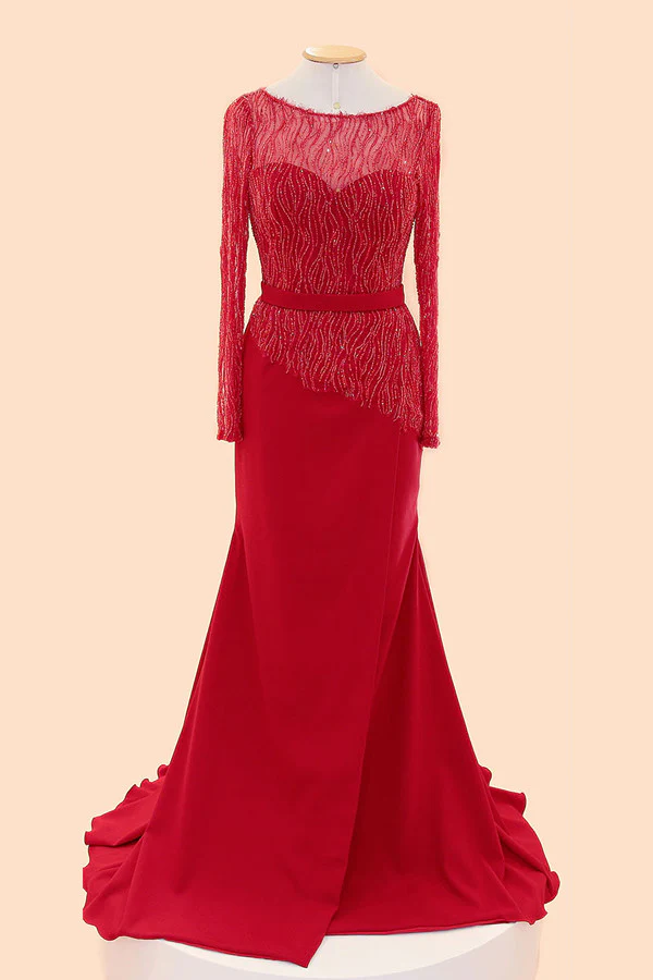 • Long Sleeves Red Beaded Cap Sleeves Prom Party Dress ED1033