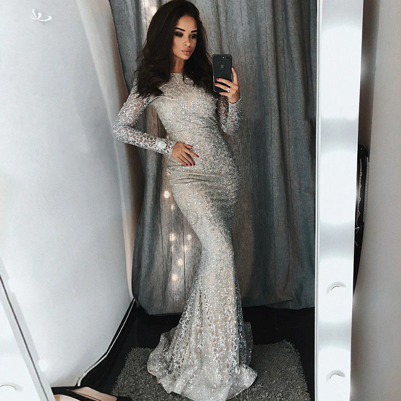 Mermaid Bateau Sliver Lace Long Sleeves Evening Prom Dresses with Sequins OKF33