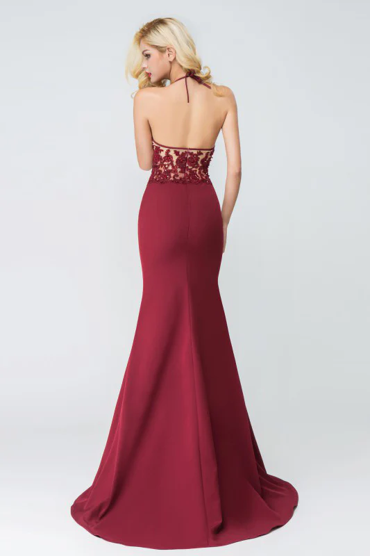 • Mermaid Halter Sleeveless Burgundy Long Split Prom Dress,Evening Dresses OKA68