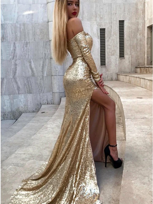 • Mermaid Long Split Prom Dress Gold Sequined Evening Dresses with Sleeves OKP6