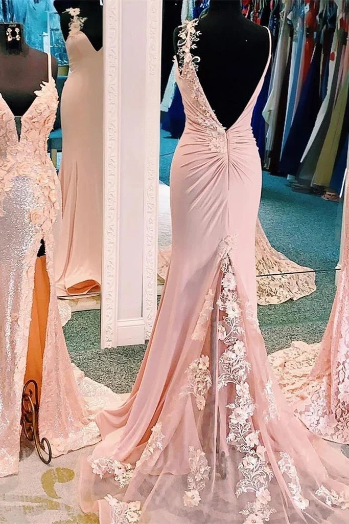 • Mermaid Pink Lace Appliques Long Prom Dress With Slit Backless Evening Dress OKT14