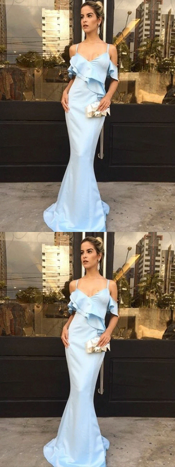 • Mermaid Spaghetti Straps Light Blue Satin Long Prom Dresses with Ruffles OKF6