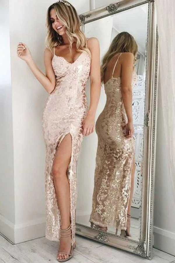 • Mermaid Spaghetti Straps Pearl Pink Sequined Split Sexy Prom Dresses OKE86