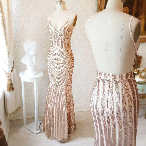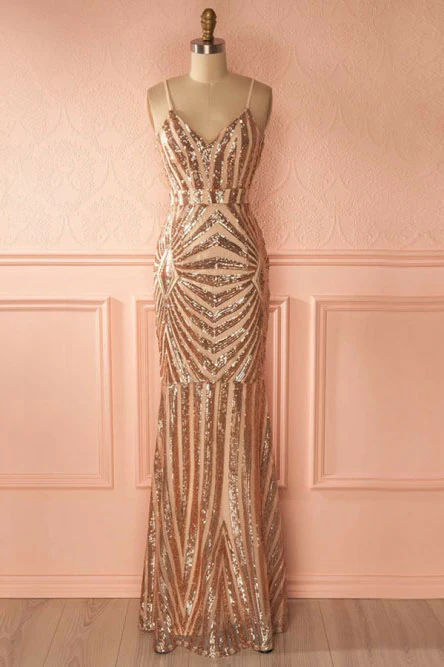 • Mermaid Spaghetti Straps Rose Gold Long Simple Prom Dress with Sequins OKD75
