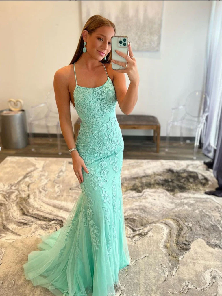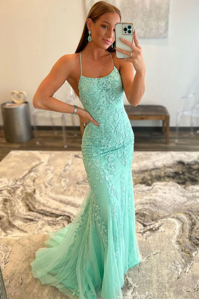 • Mint Green Lace Appliques Mermaid Backless Long Prom Dress Evening Dress OK1286