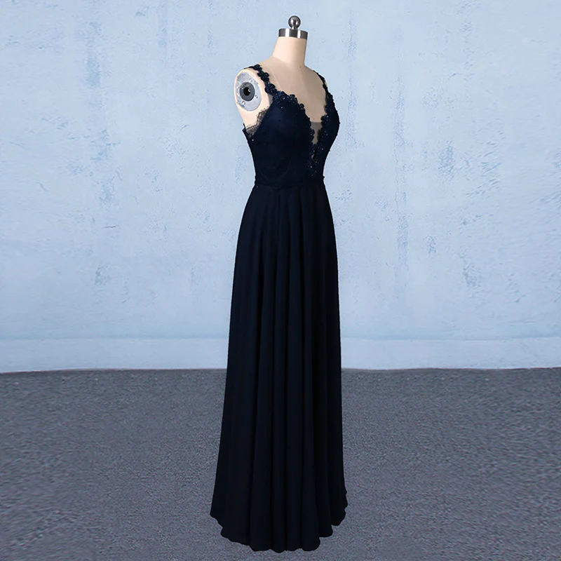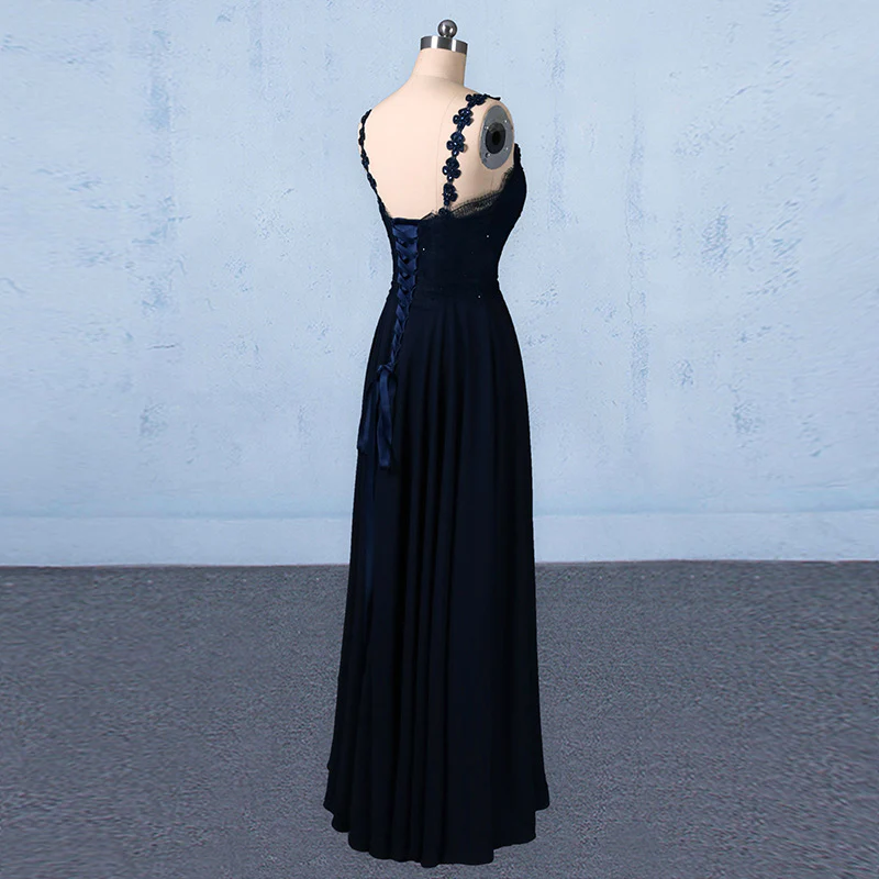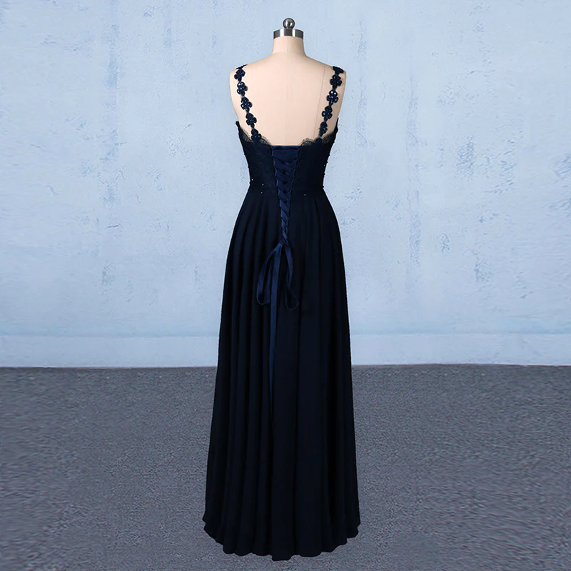 • Navy Blue Chiffon V Neck A Line Long Prom Dress With Lace Top OKQ21