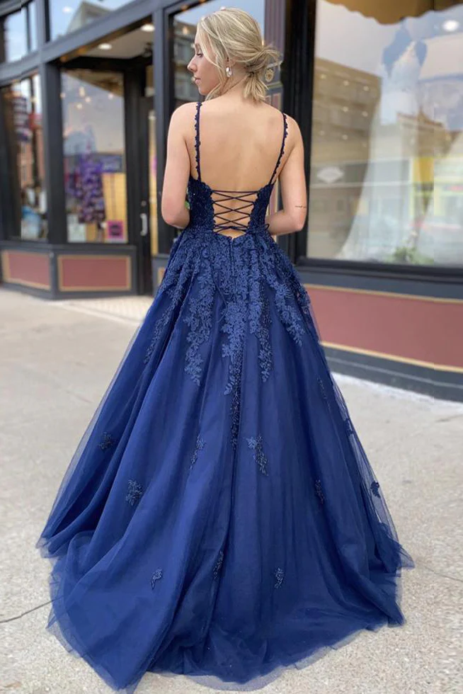 Navy Blue Tulle Lace Appliques Prom Dress A-line Long Formal Evening Dress OKX59