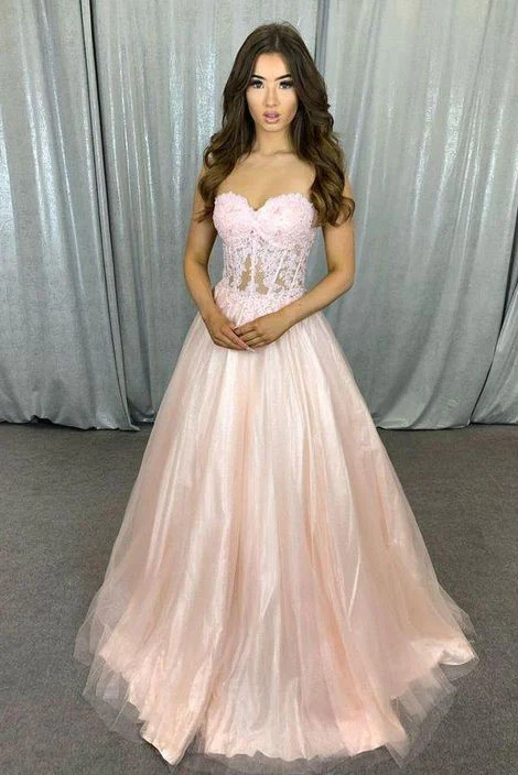 New Arrival Pink A-Line Tulle Sweetheart Long Prom Dresses With Appliques OK1799