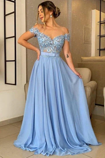 • Off the Shoulder A Line Chiffon Blue Long Prom Sresses Appliques Evening Dress OK1330