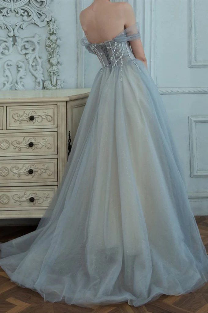 • Off the Shoulder A-line Tulle Prom Dress For Women Long Party Dress OKW10