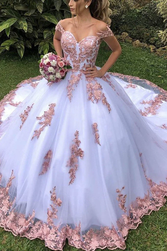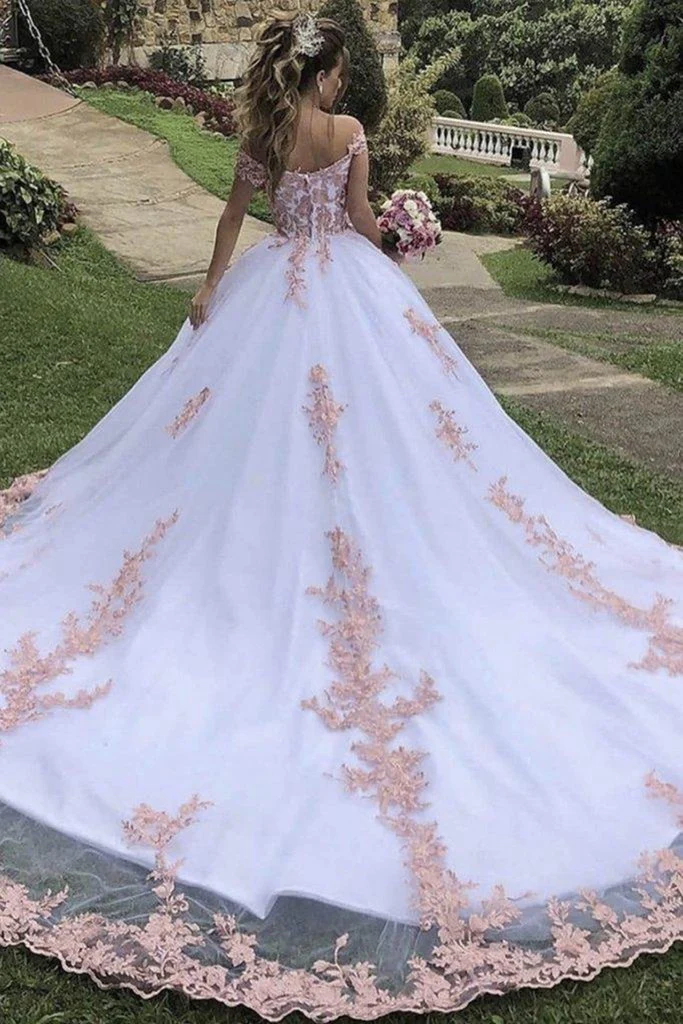 Off the Shoulder White Lace Appliques Tulle Long Prom Dress Formal Evening Dress White Ball Gown OKZ23
