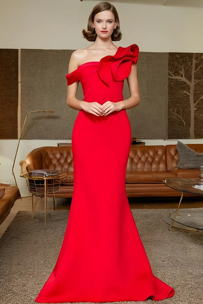 • Red One Shoulder Sleeveless Prom Dress
