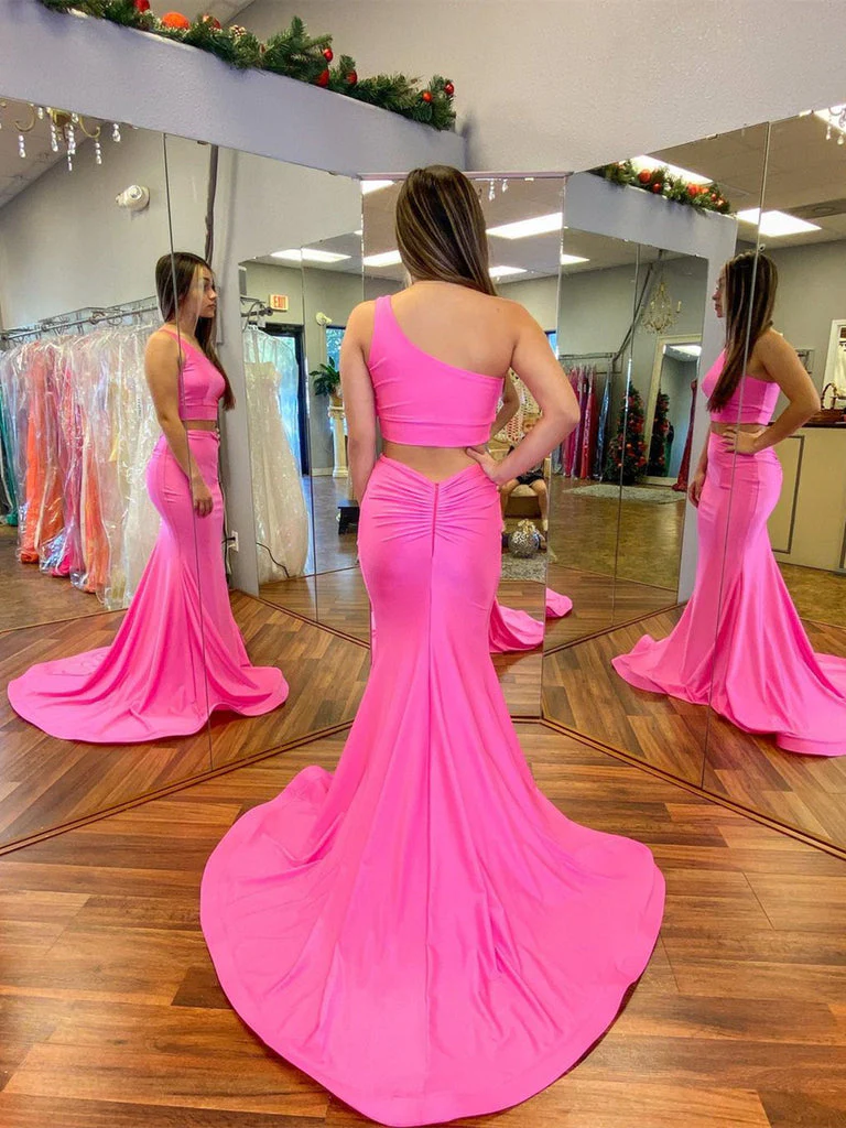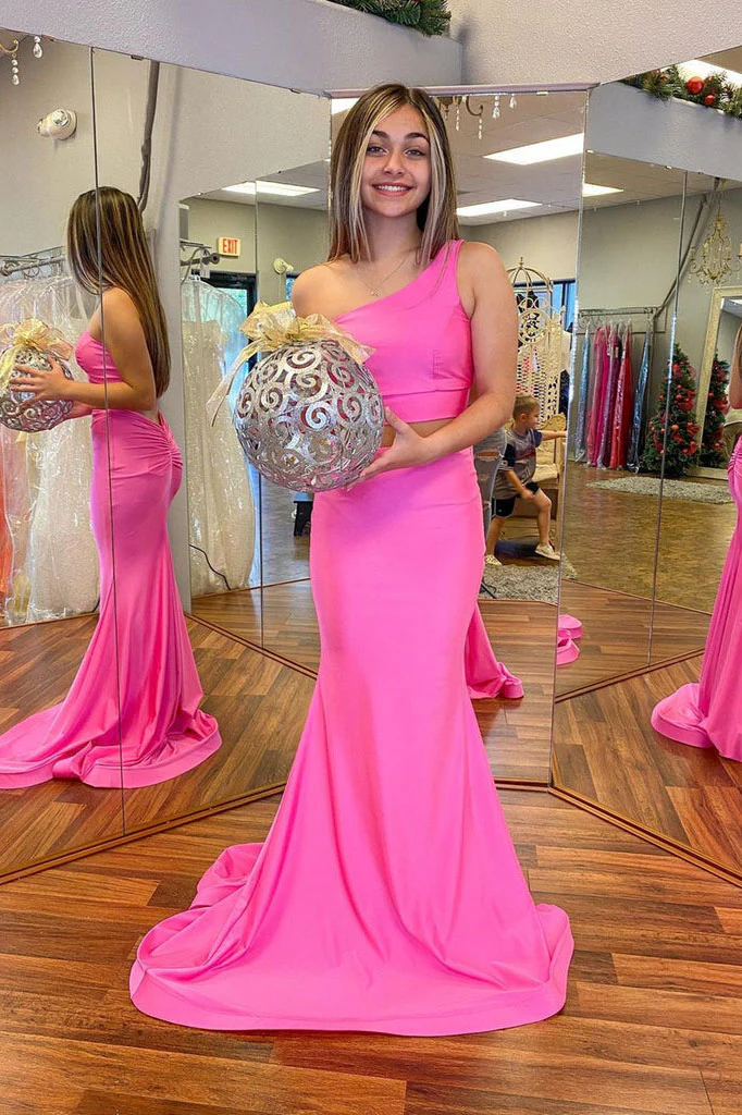 • One Shoulder Two Pieces Hot Pink Long Prom Dress Formal Graduation Evening Dress OK1296