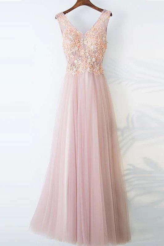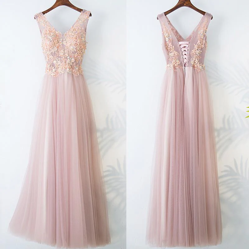• Pearl Pink Lace Top V-neck A Line Floor-length Long Tulle Beautiful Prom Dresses OK877