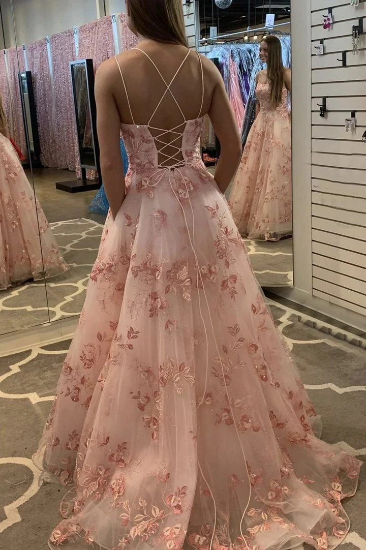 • Pink A Line Tulle Lace Appliques Long Prom Dress Formal Evening Dress OK1329