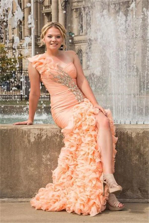 • Pink One Shoulder Lace Up Front Split Long Beading Prom Dress K705