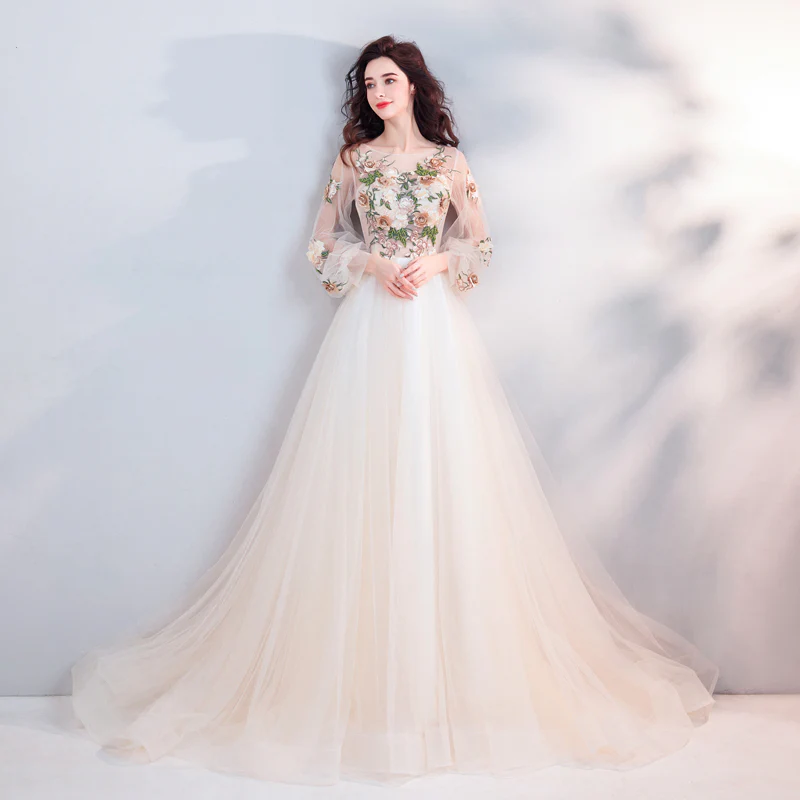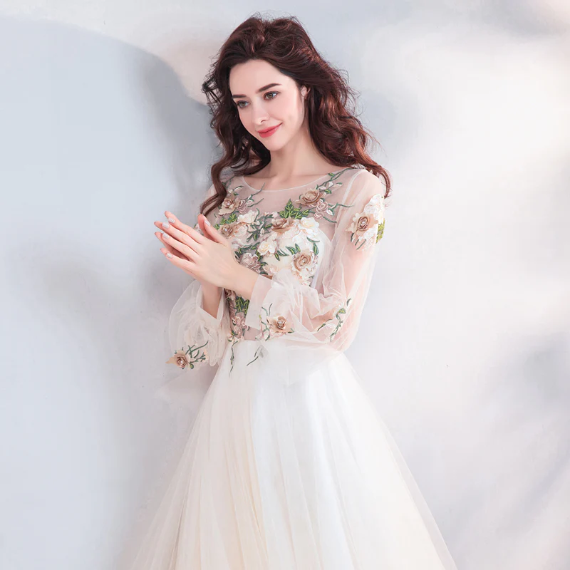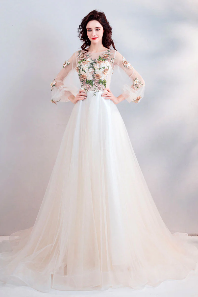 • Pretty A Line Long Sleeves Tulle Appliques Prom Dress With Flowers OKG69