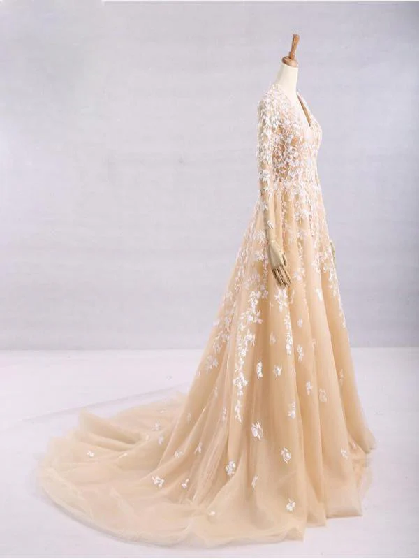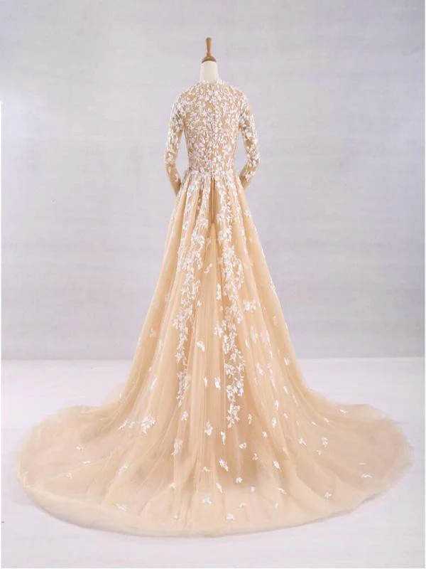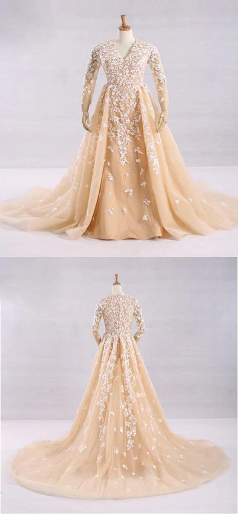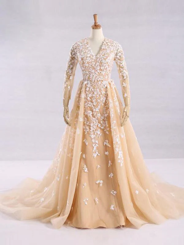 Pretty A-Line V-Neck Long Sleeves Tulle Appliques Floor Length Prom Dress OKG32