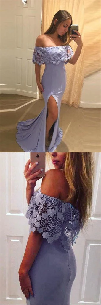 Pretty Lavender Off Shoulder With Lace Split Mermaid Prom Dress OKF15