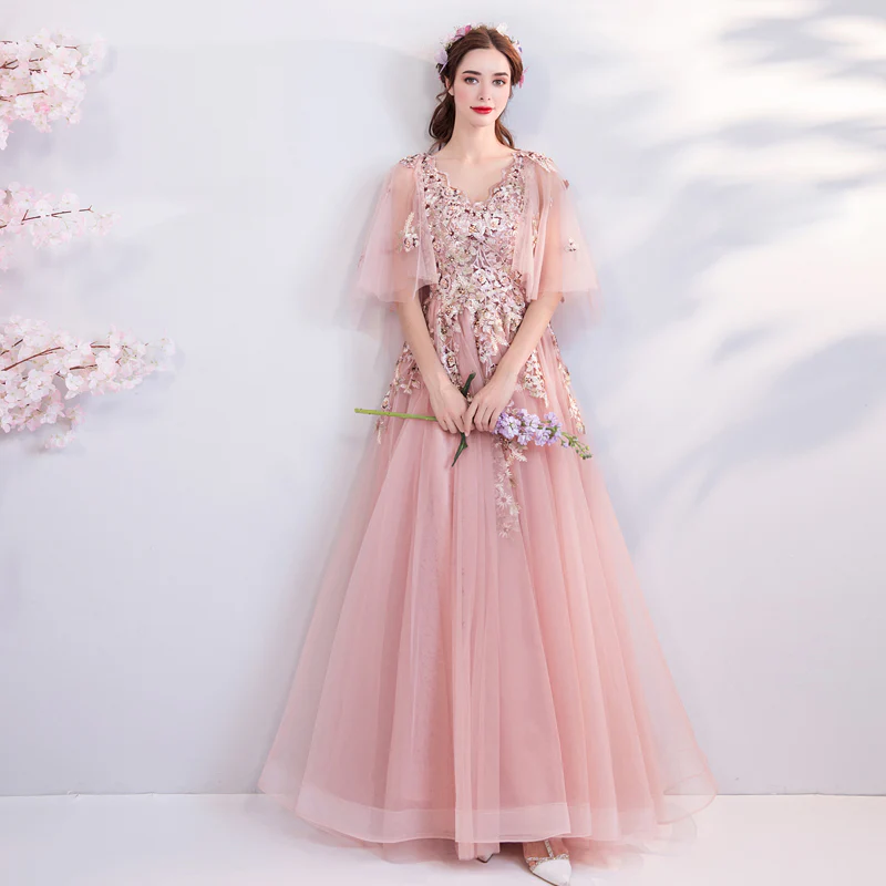 Princess A Line Pink Long Tulle Appliques V Neck Prom Dress OKG68